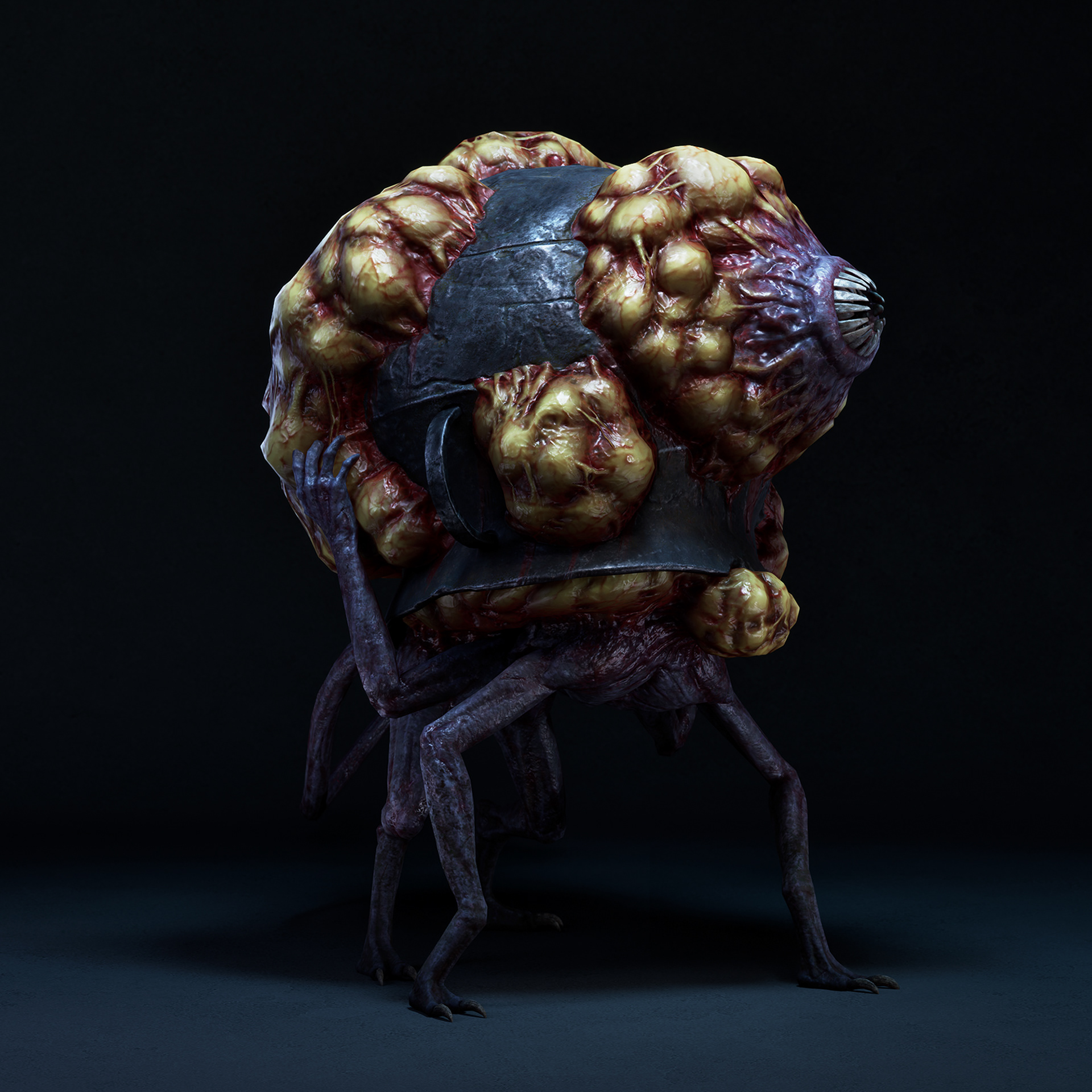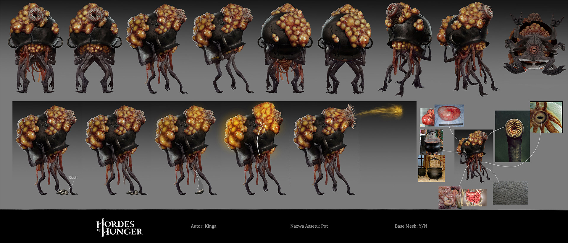 "Claudron" character I crafted for Hordes of Hunger game. I was responsible for the full creation pipeline, block-out, high-poly sculpting in ZBrush, assets modeling in Blender, retopology in Blender, UV unwrapping in RizomUV, texturing in Substance Painter and shader/texture configuration in Unreal Engine 5. Character based on a concept by Kinga Makowska.
