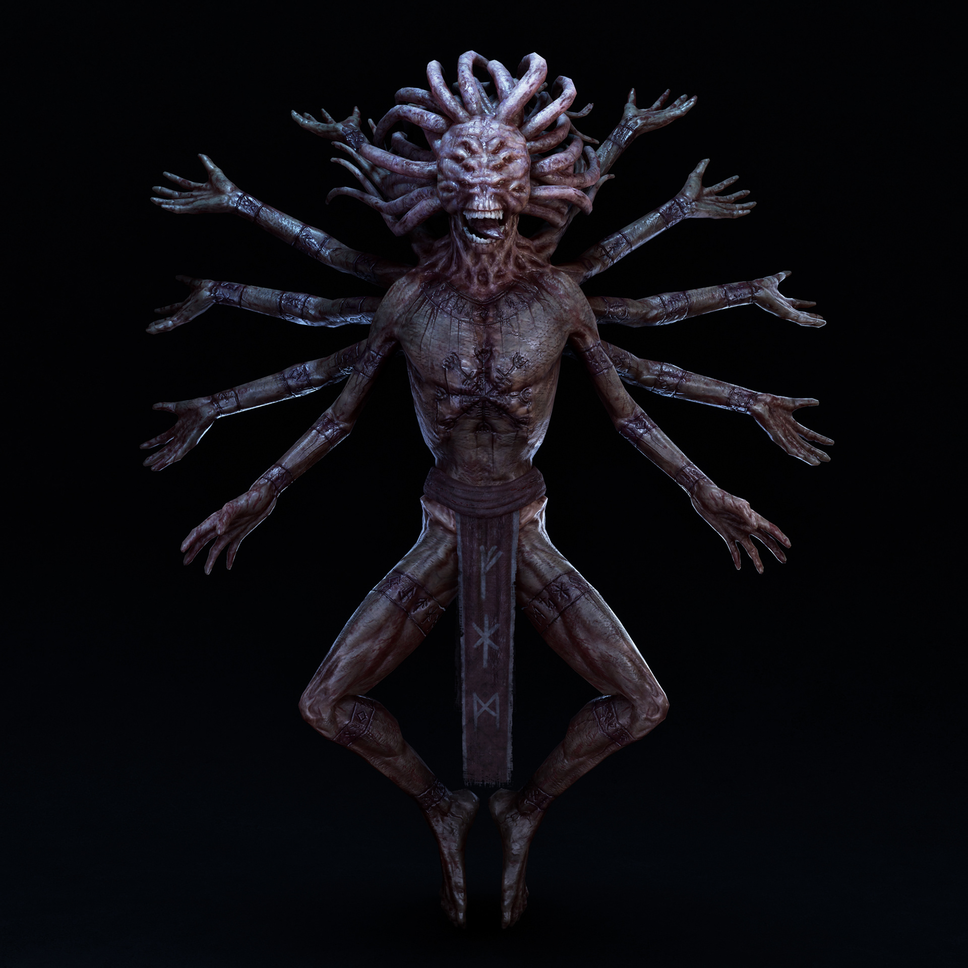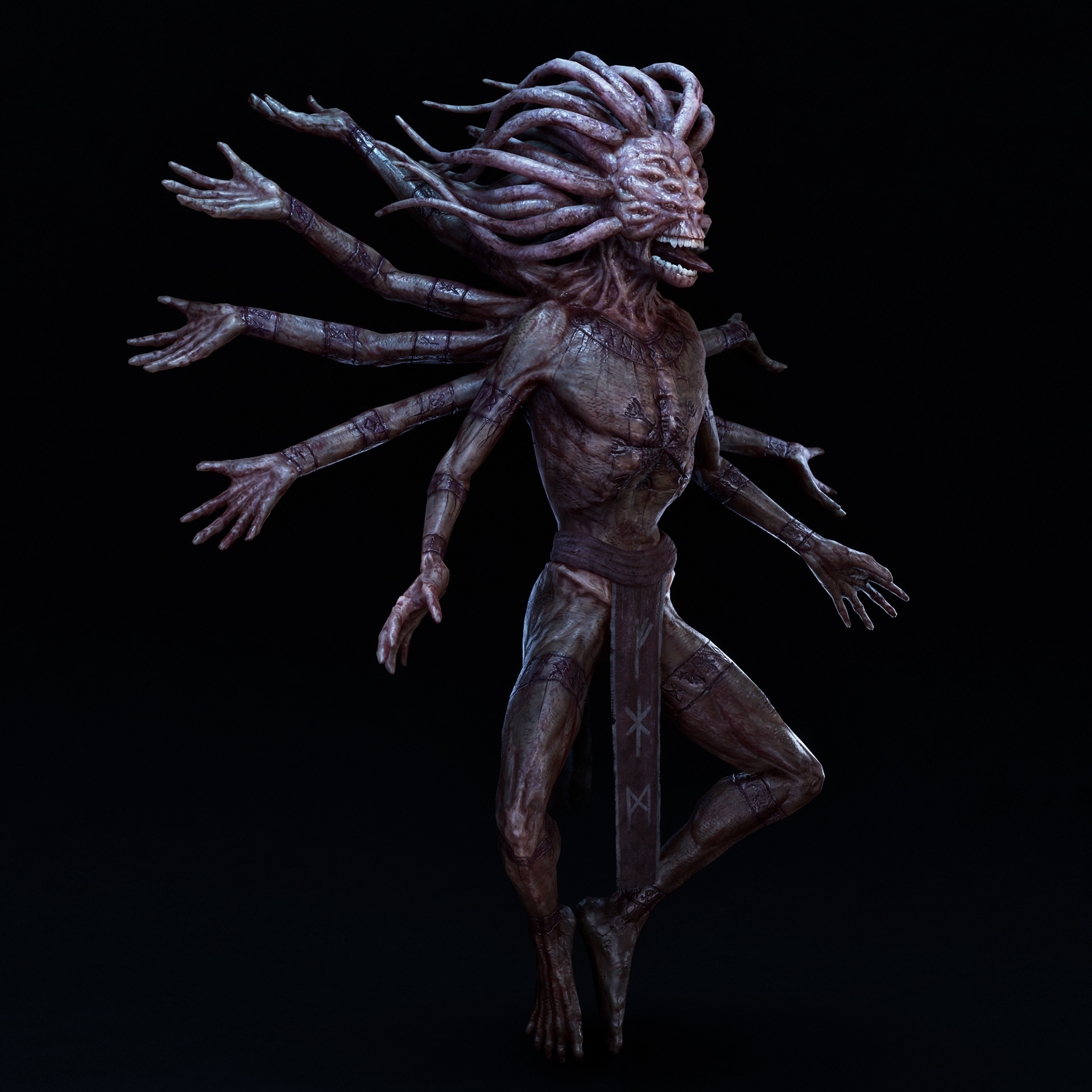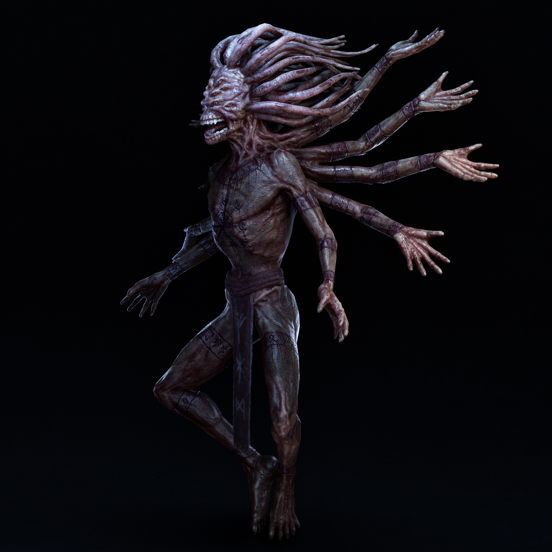 "Curse Mage" character I crafted for Hordes of Hunger game. I was responsible for the full creation pipeline, block-out, high-poly sculpting in ZBrush, retopology in Blender, UV unwrapping in RizomUV, texturing in Substance Painter and shader/texture configuration in Unreal Engine 5. Character based on a concept by Kinga Makowska.